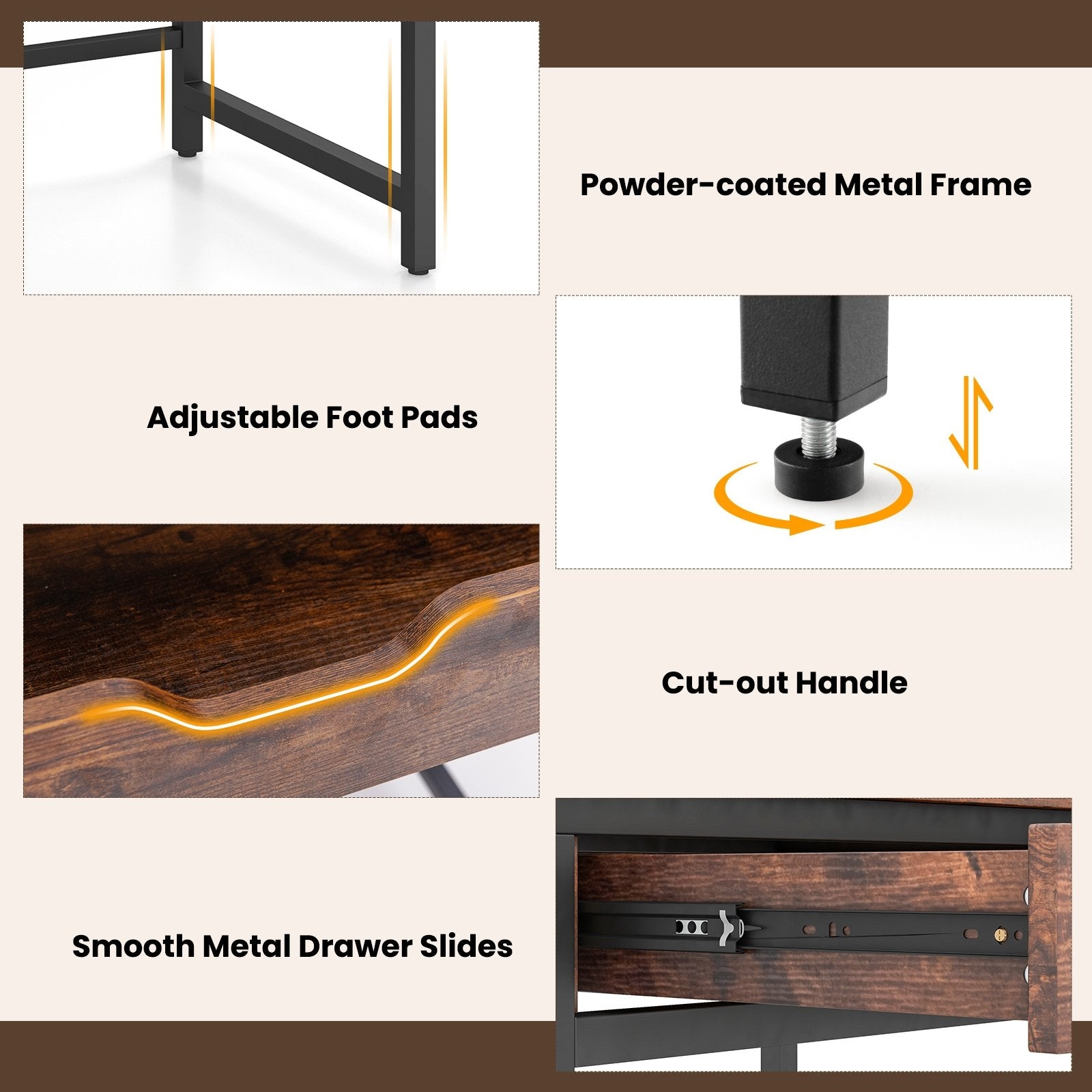 Robust Metal Frame: The metal frame provides a stable and secure foundation for your work activities. Coupled with a premium top the study desk boasts strength and durability. Plus the adjustable foot pads can well adapt to uneven floors.