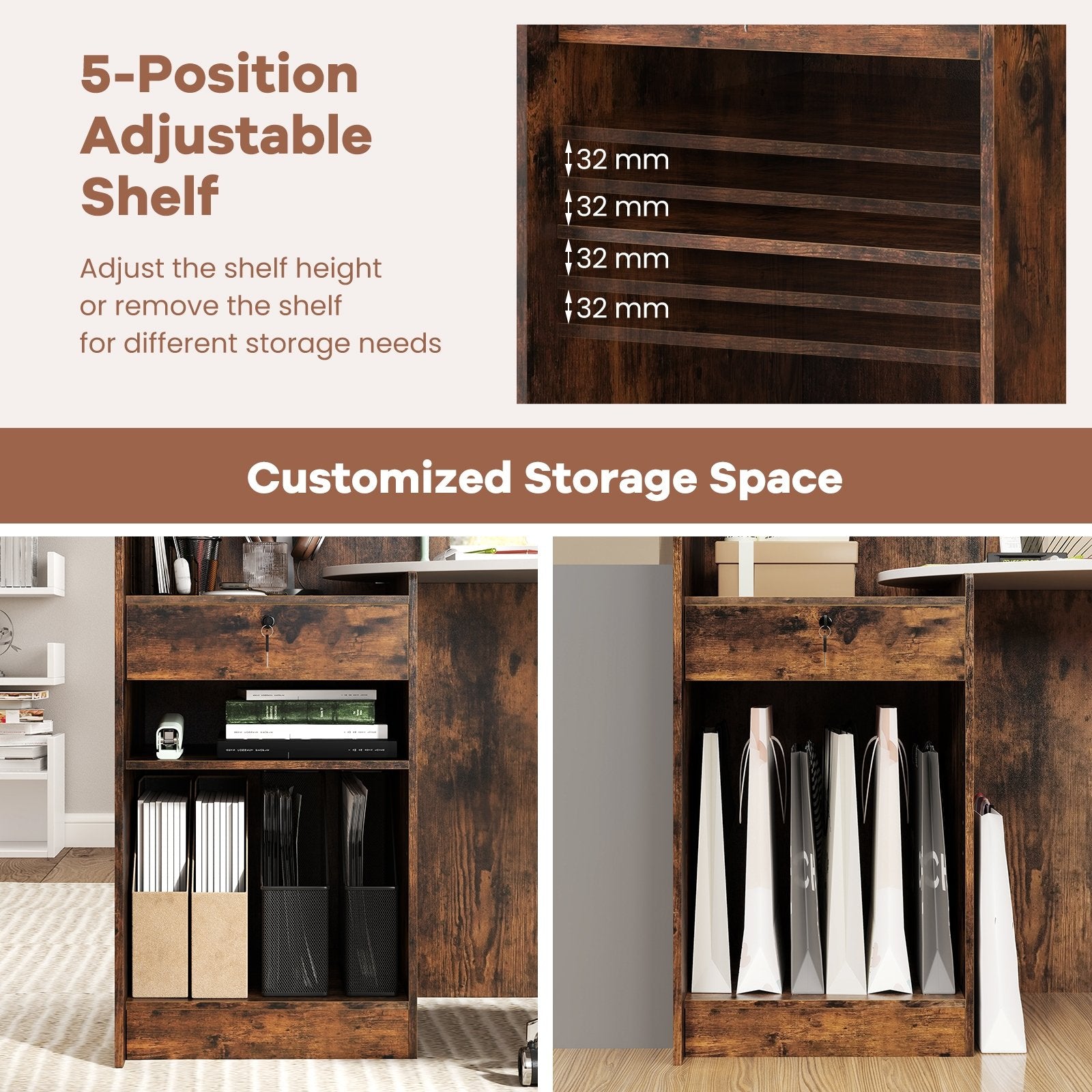 Spacious Design: The reception desk boasts a generous oval tabletop providing ample space for work and organization. It also includes a side compartment with a 5-position adjustable shelf with 1.3" clearance allowing for flexible storage solutions to accommodate items of varying sizes.