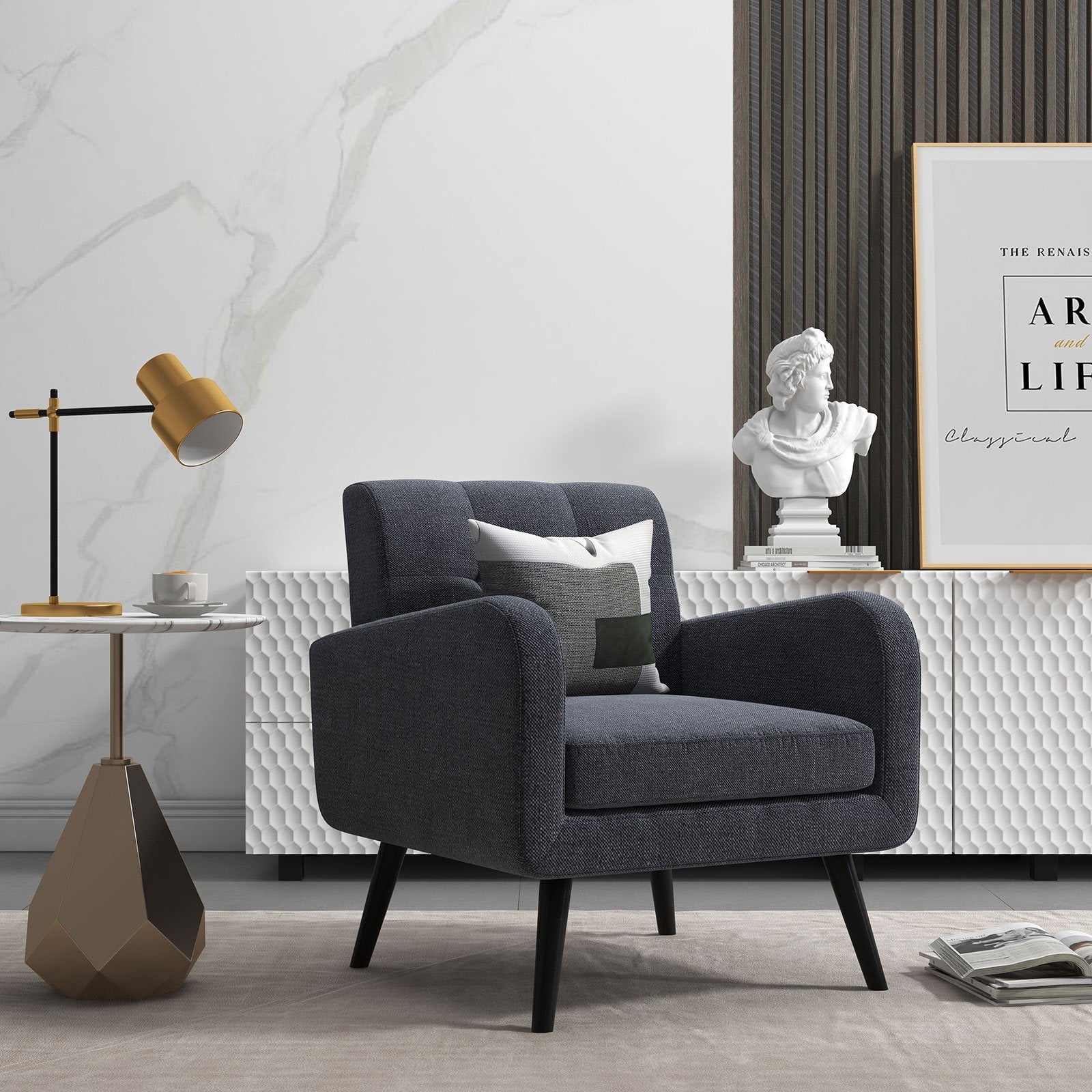 Supported by solid rubberwood legs the armchair ensures good stability and strong bearing strength. Wide backrest and thick cushion are padded with a highly elastic sponge for optimal softness. Moreover the fine linen cover is breathable and skin-friendly to offer you a comfortable sitting experience. Lean on the padded backrest put your arm on the armrest and take a rest for a moment of physical relaxation. Elegant style with the tufted back design creates an attractive look which fits well with your personal taste and home decor.
