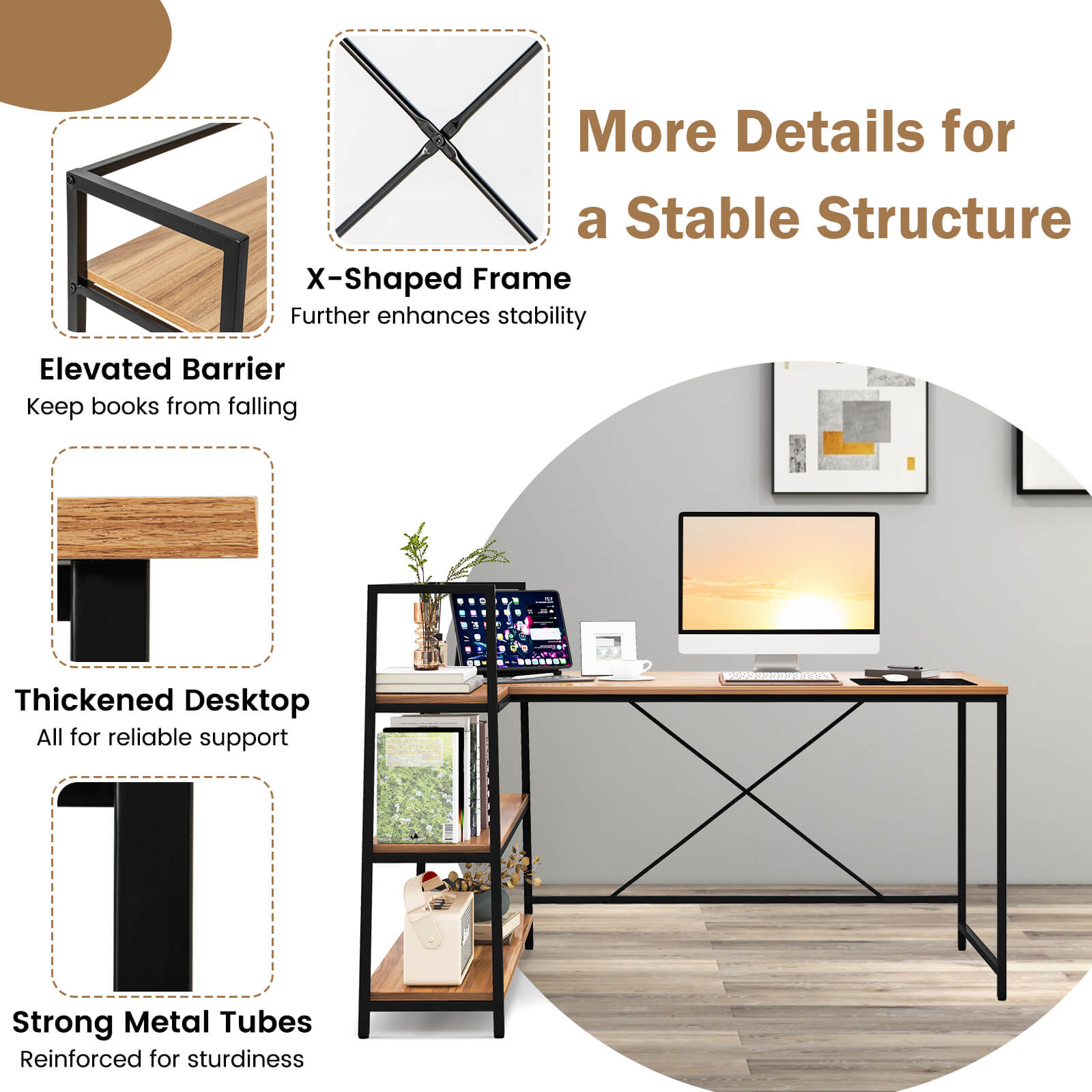 Reversible L-Shaped Design: Making every space practical the computer desk comes with an L-shaped design to fit in a corner and create a roomy office space. Plus with a reversible theory the side bookshelf allows for left or right installations with great flexibility to match different space layouts.