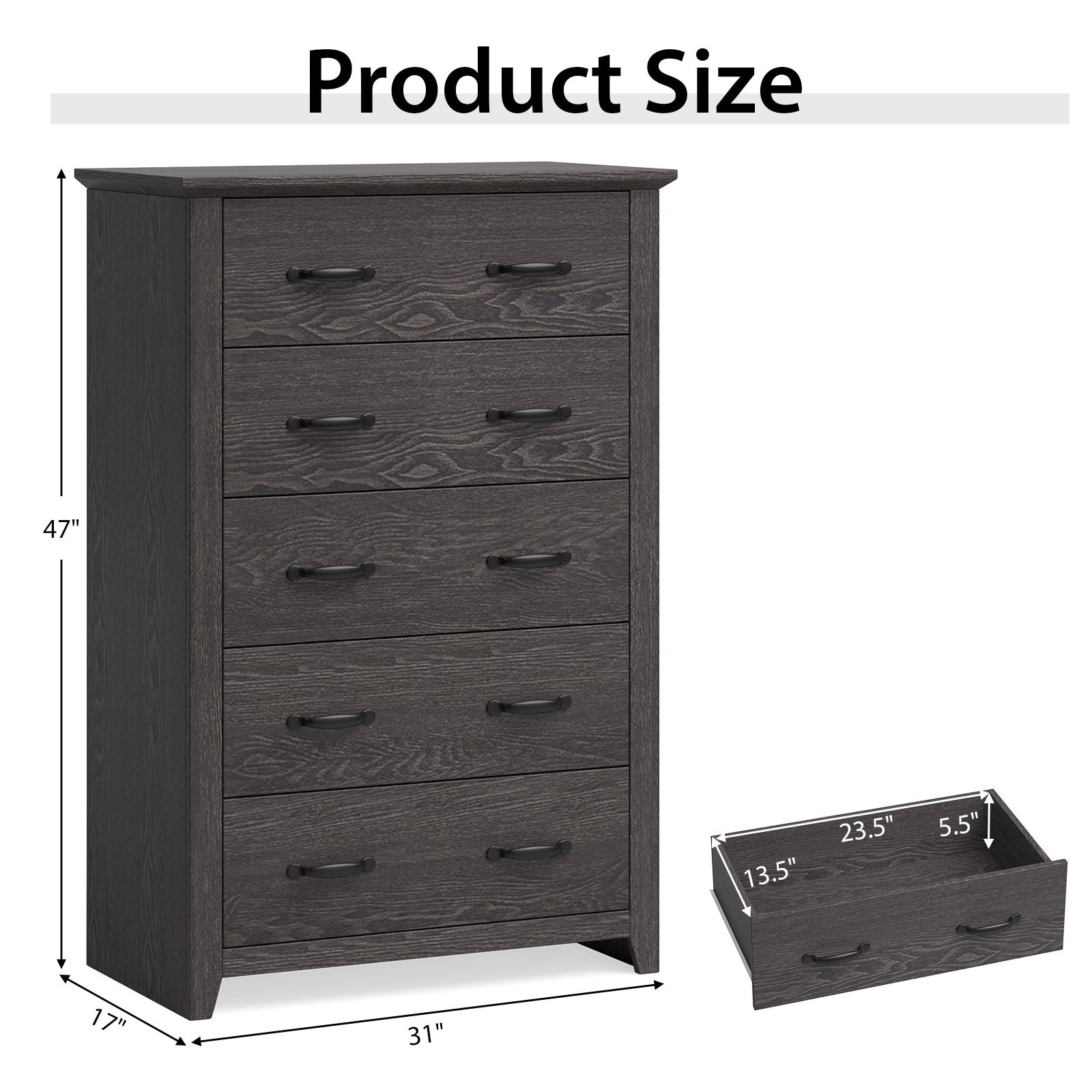 Generous Storage Space: The tall storage dresser features 5 slide-out drawers(size: 23.5" x 13.5" x 5.5") offering ample storage space to keep daily essentials well organized. In addition the spacious top is a perfect platform to display decorations and other items.