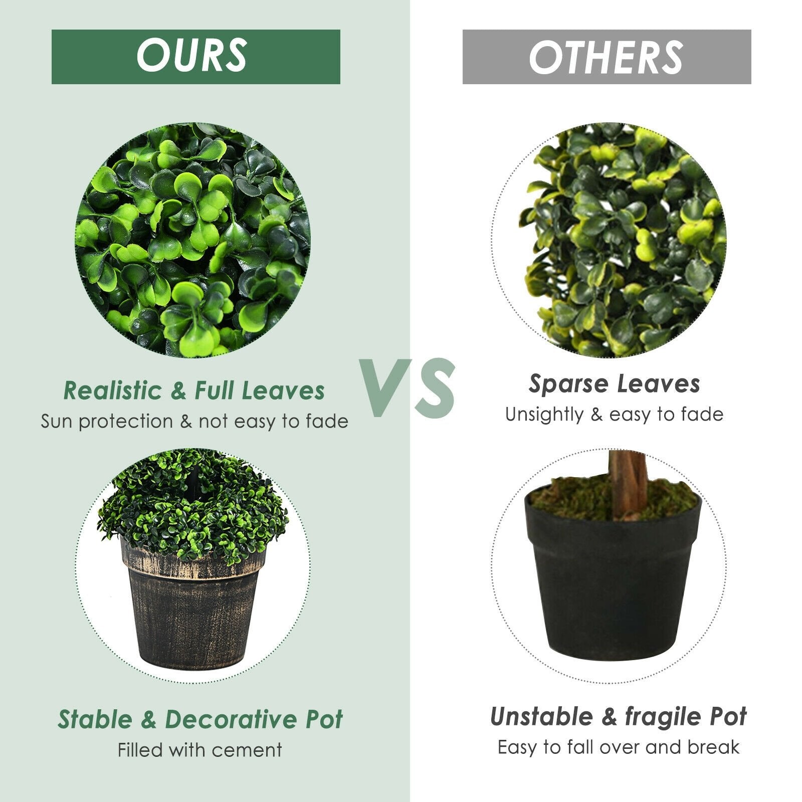 Stable and Sturdy Base: The 2-Pack faux topiary tree set comes with golden pots that are filled with solid cement which provide strong support and prevent kids and pets from knocking it down. Supported by the iron tube the tree is ultra-sturdy. Deformation and breaking are effectively avoided.