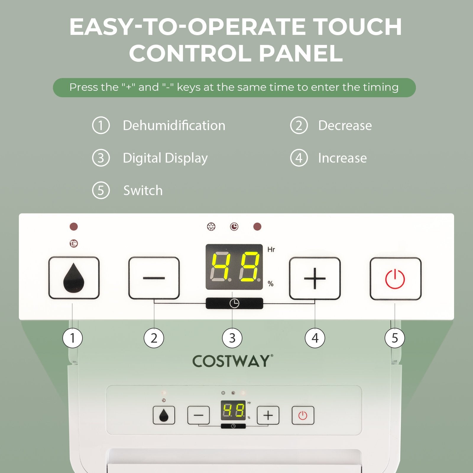 Easy Operation and Ultra Quiet: The dehumidifier comes with an easy-to-operate touch control panel and clear digital display. You can press the "+" and "-" keys at the same time to enter the timing and set 0-24 hour timer as you need. Plus the low noise operation≤38.6 dB won't disrupt your sleep.