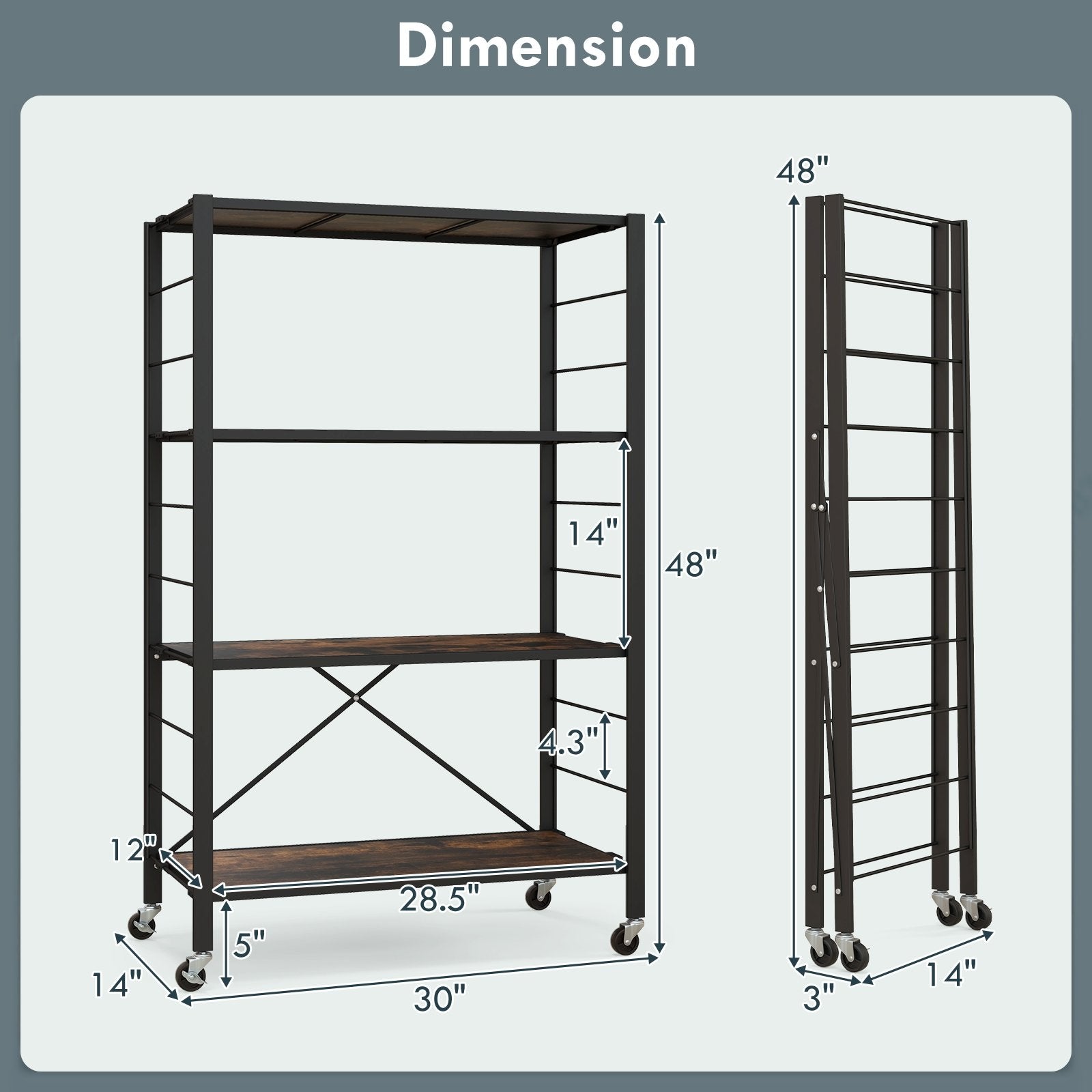 Space-savvy Design: Optimize your limited space with this compact storage rack. Its vertical design allows it to take up less floor space while providing large storage space. Embrace organized living and bid farewell to clutter with this innovative shelf. More the shelf can be folded to store when not in use.