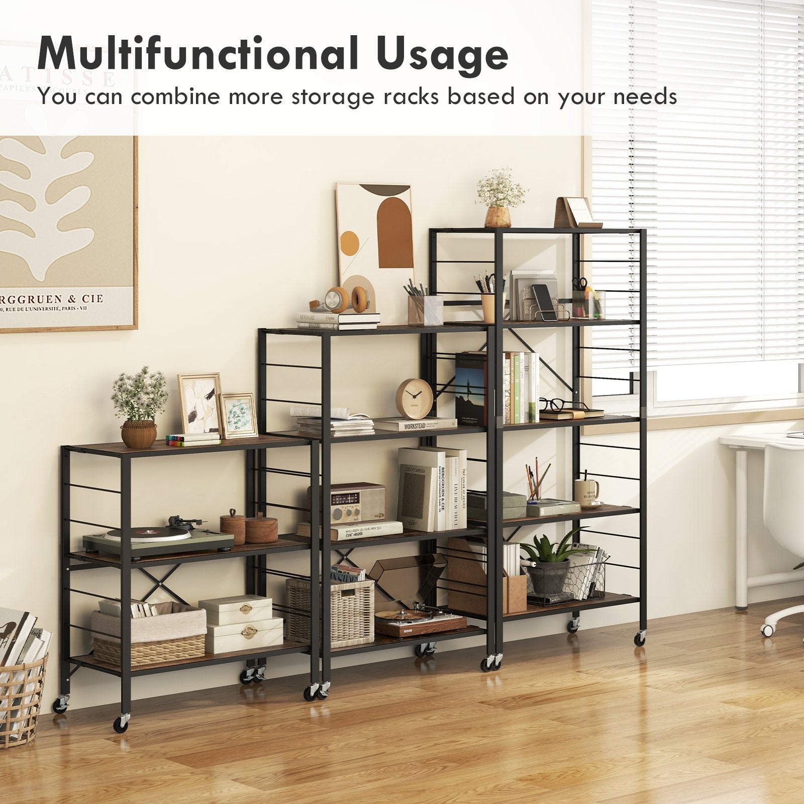 Robust Metal Construction: Constructed from enduring powder-coated metal this storage organizer boasts a heavy-duty frame capable of holding up to 180 lbs. The sturdy structure coupled with 1 anti-toppling device ensures lasting support and stability for your belongings.
