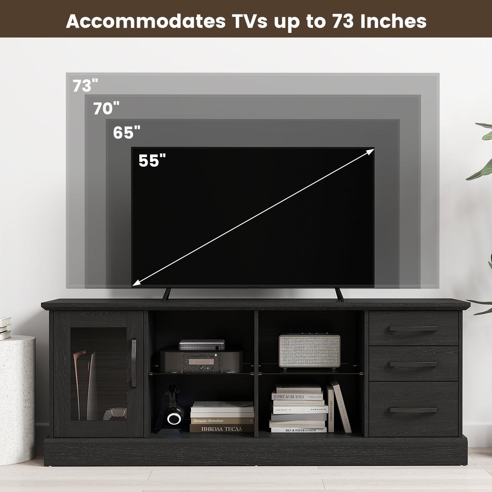 -Accommodates TVs of various sizes including 55" 65" 70" and 73"