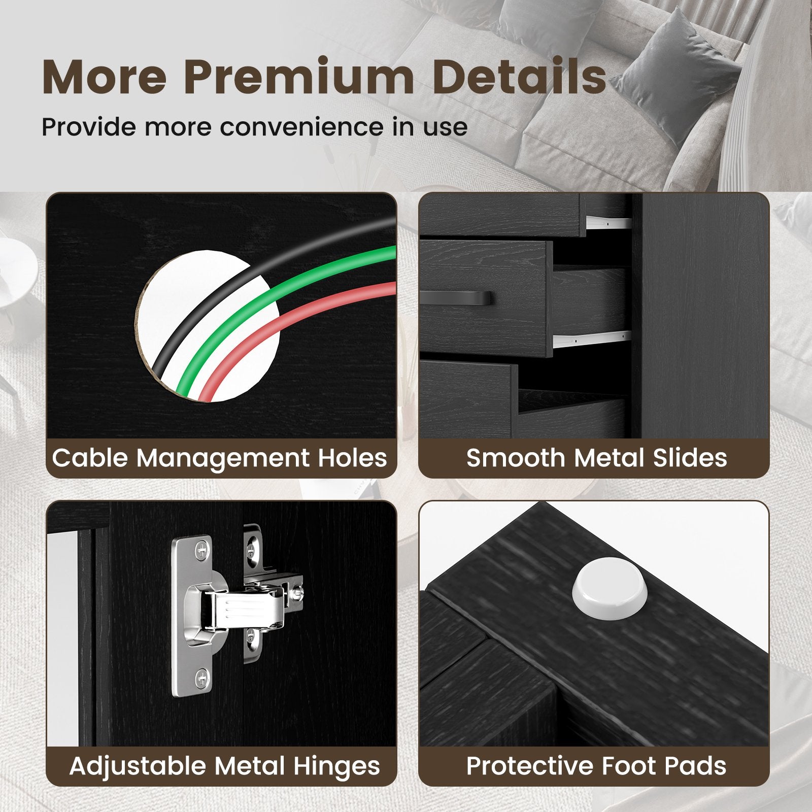 More Premium Details: The entertainment center includes cable holes for efficient wire management. The metal hinges ensure perfectly aligned door gaps while the protective foot pads prevent any scratches on your flooring.