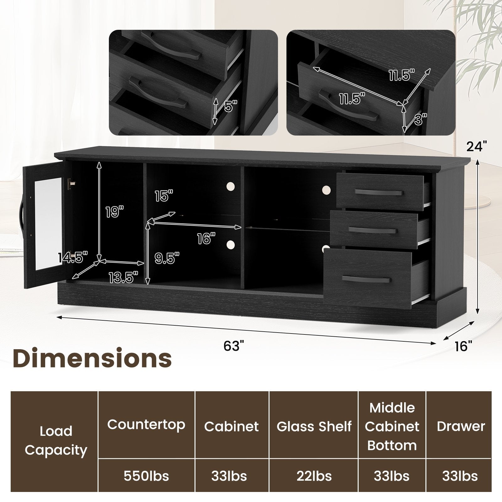 Wide and Sturdy Countertop: With a generous 63"L x 16"W countertop the TV stand accommodates TVs up to 73 inches. Meanwhile the robust countertop confidently supports up to 550 lbs ensuring a stable and secure media center.