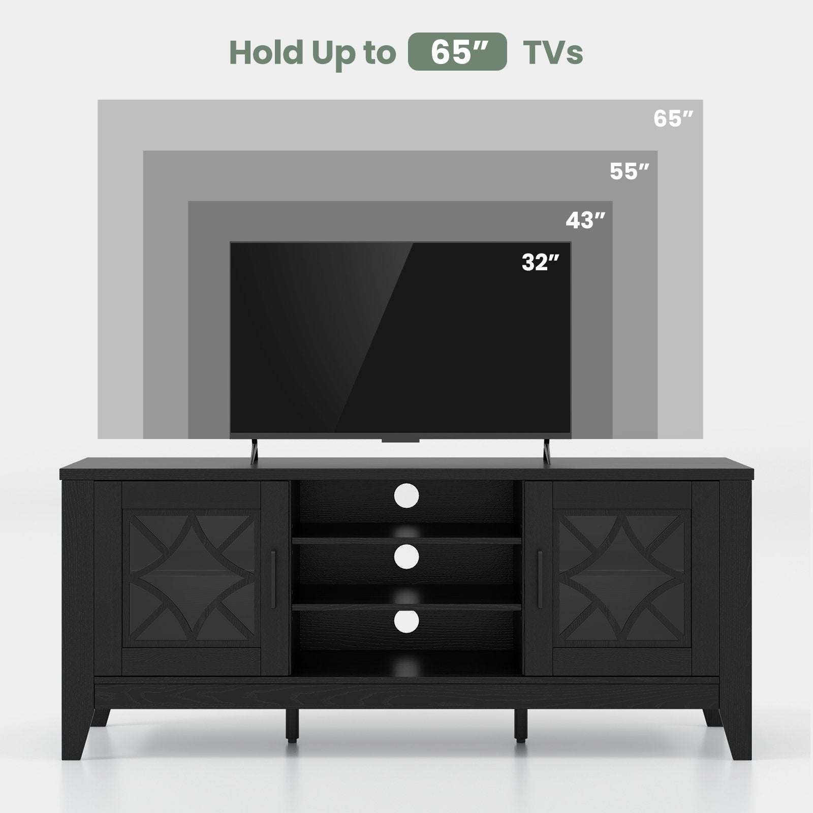 -Spacious tabletop will hold up to 32"/43"/55"/65" TVs
