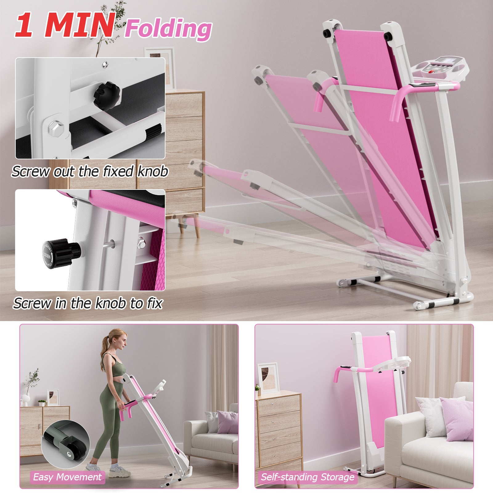 Easy Folding and Tool-Free Assembly: This treadmill requires 100% tool-free assembly and the 2-step folding and setup largely simplify the folding process: ①screw out the fixed knob ②screw in the knob to fix. Plus the folded treadmill is free-standing and 2 transport wheels make movement and storage easier.
