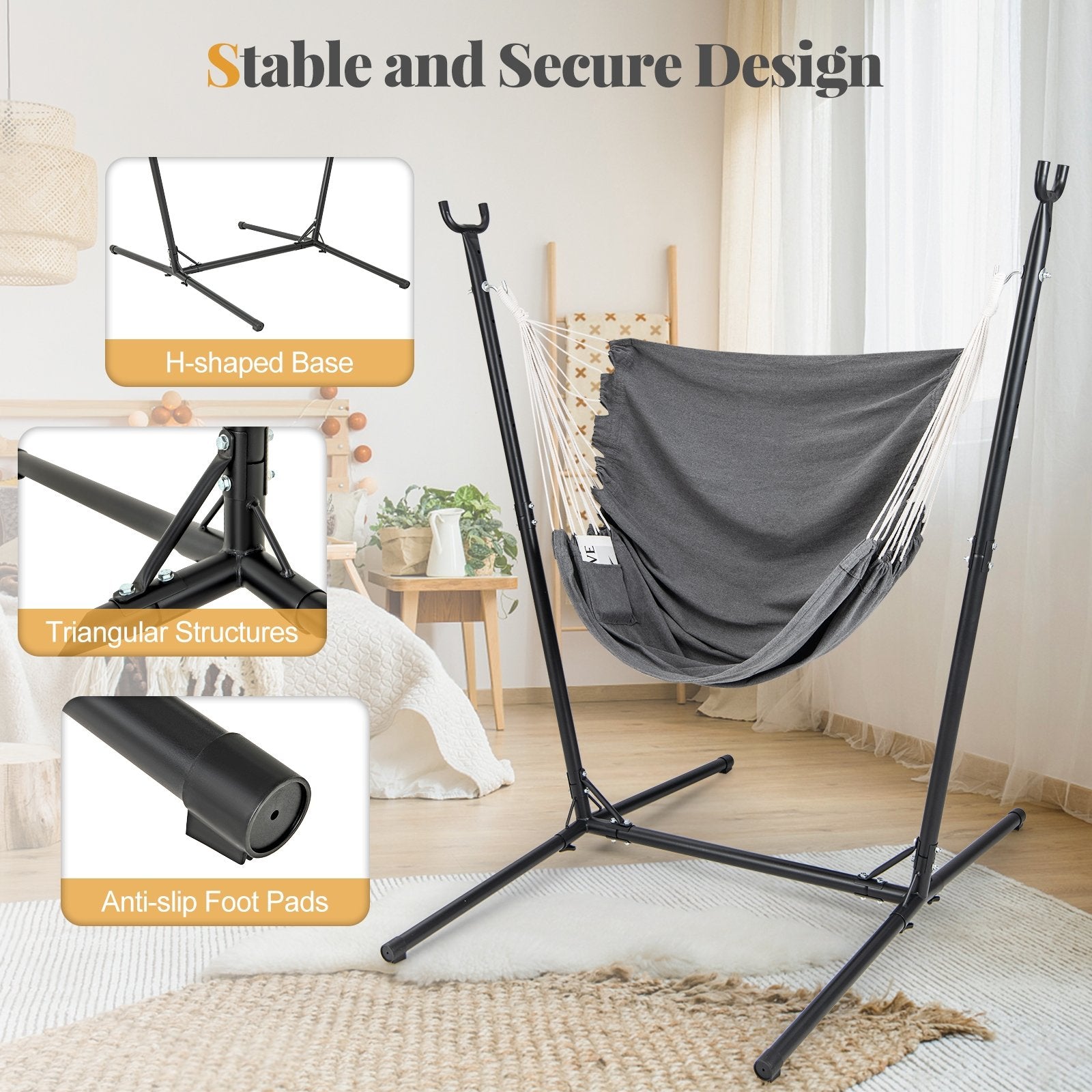 Stable and Secure Design: The swing chair boasts an H-shaped base with triangular support structures providing a stable foundation for your relaxation. Additionally the anti-slip foot pads further enhance the overall stability.