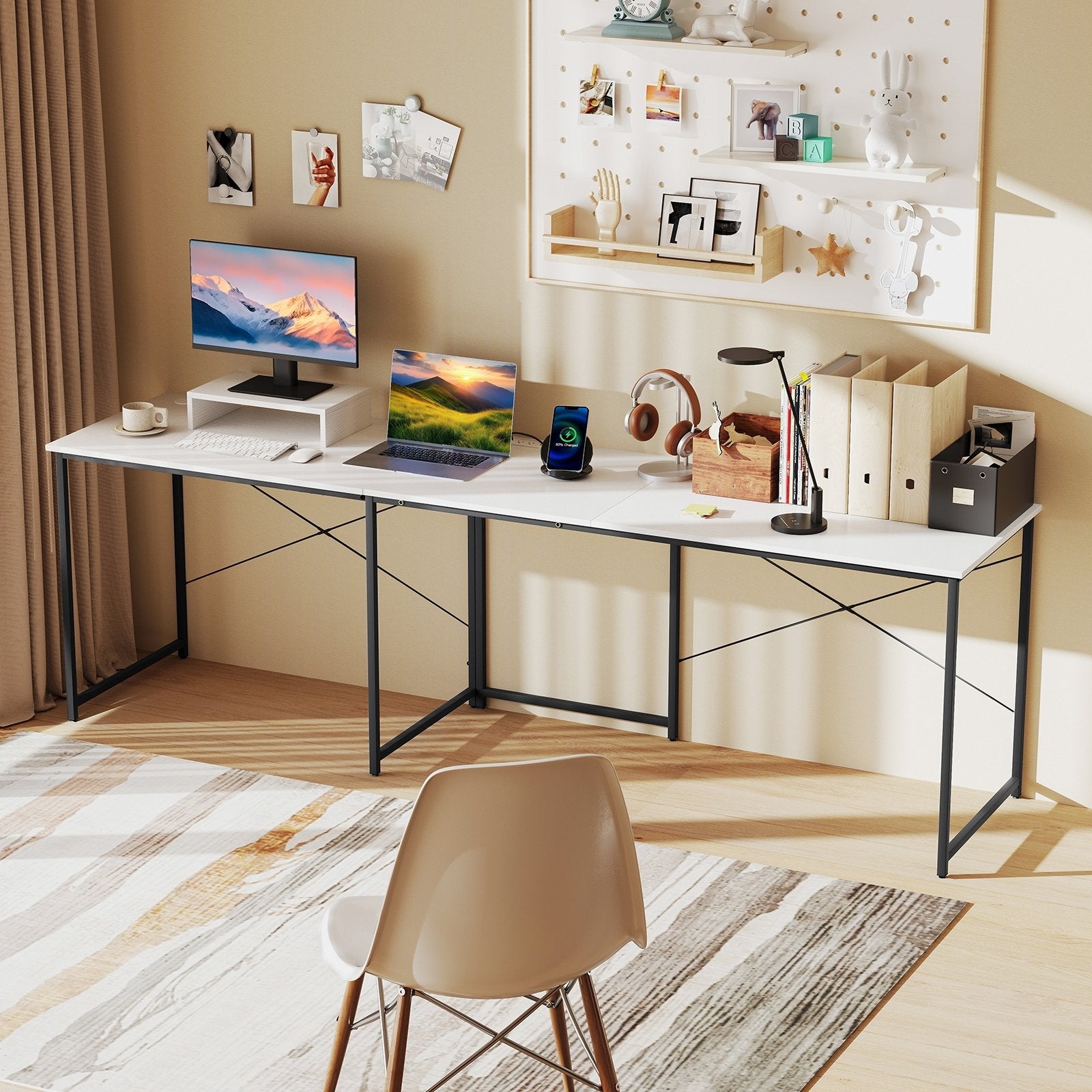 Flexible Installation Options: This computer desk can be easily configured in 2 ways. It can be set up as an L-shaped corner desk making the most of the room's corner space. Alternatively it can be assembled into a 95" long 2-person desk accommodating multiple users at once.