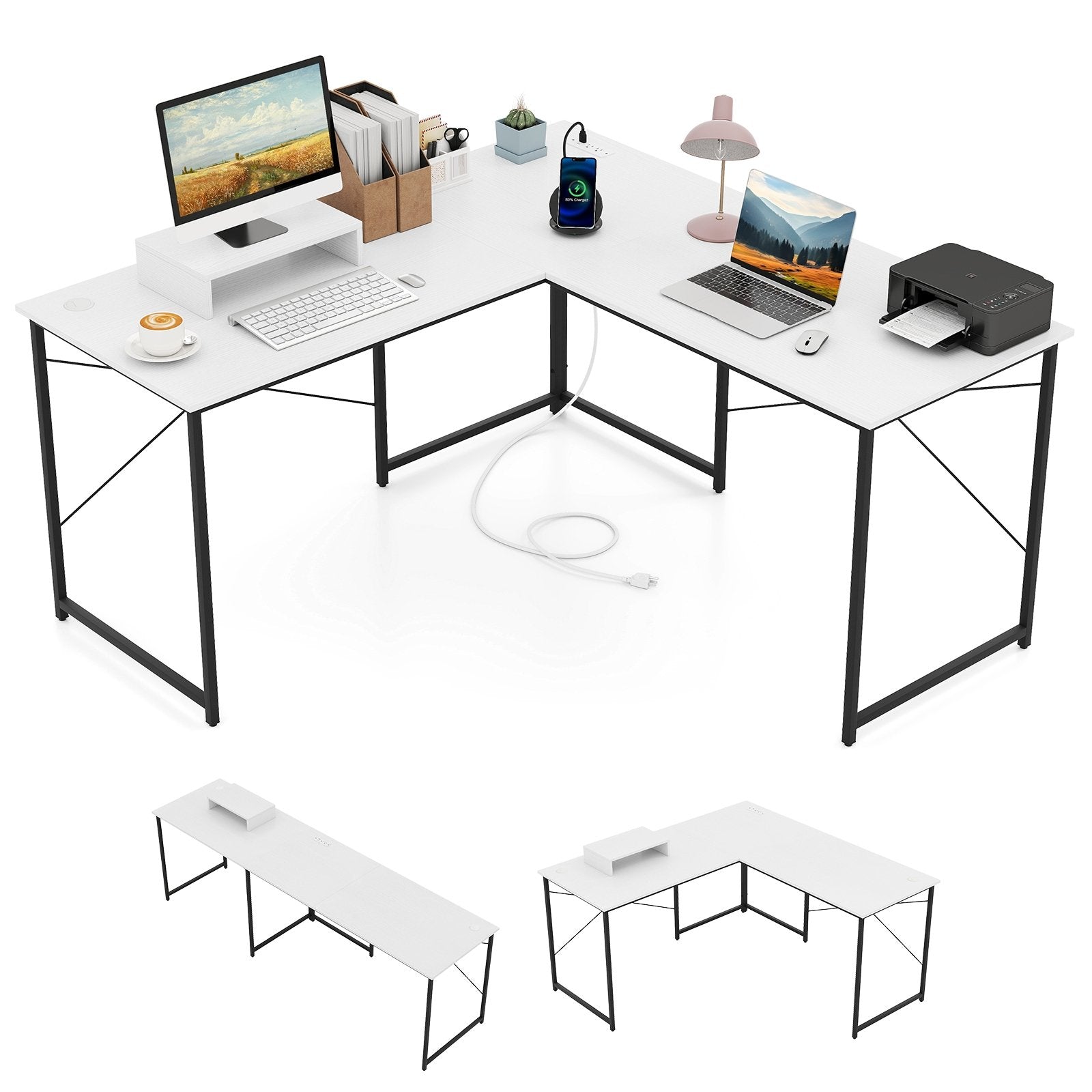 L-Shaped Computer Desk with Power Outlets and Monitor Shelf-White