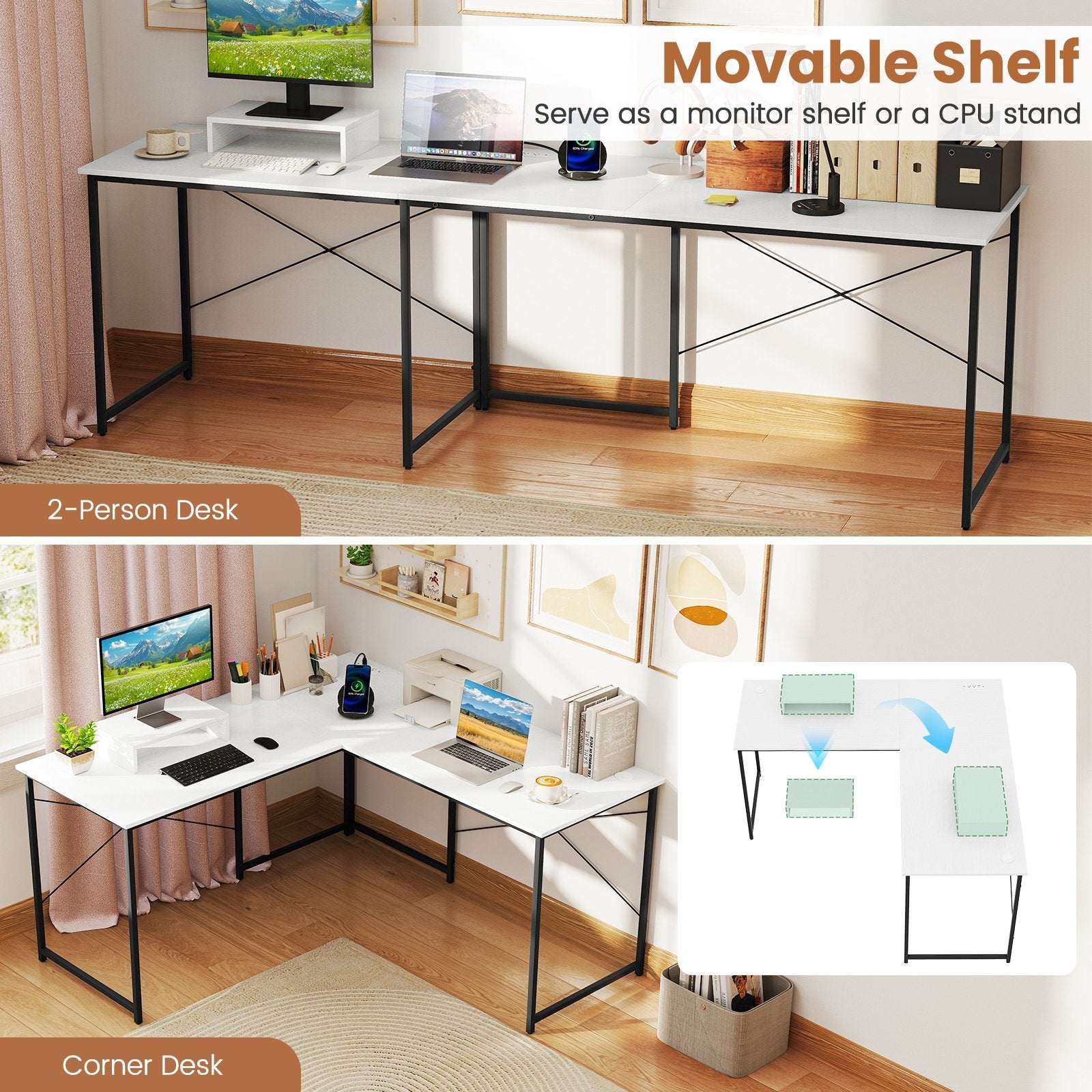Versatile Monitor Shelf: The corner desk features a removable monitor shelf that allows you to elevate your monitor to an optimal viewing height for enhanced comfort and ergonomics. This shelf can be conveniently placed either on top of the desk or underneath it serving as a CPU stand when positioned below.