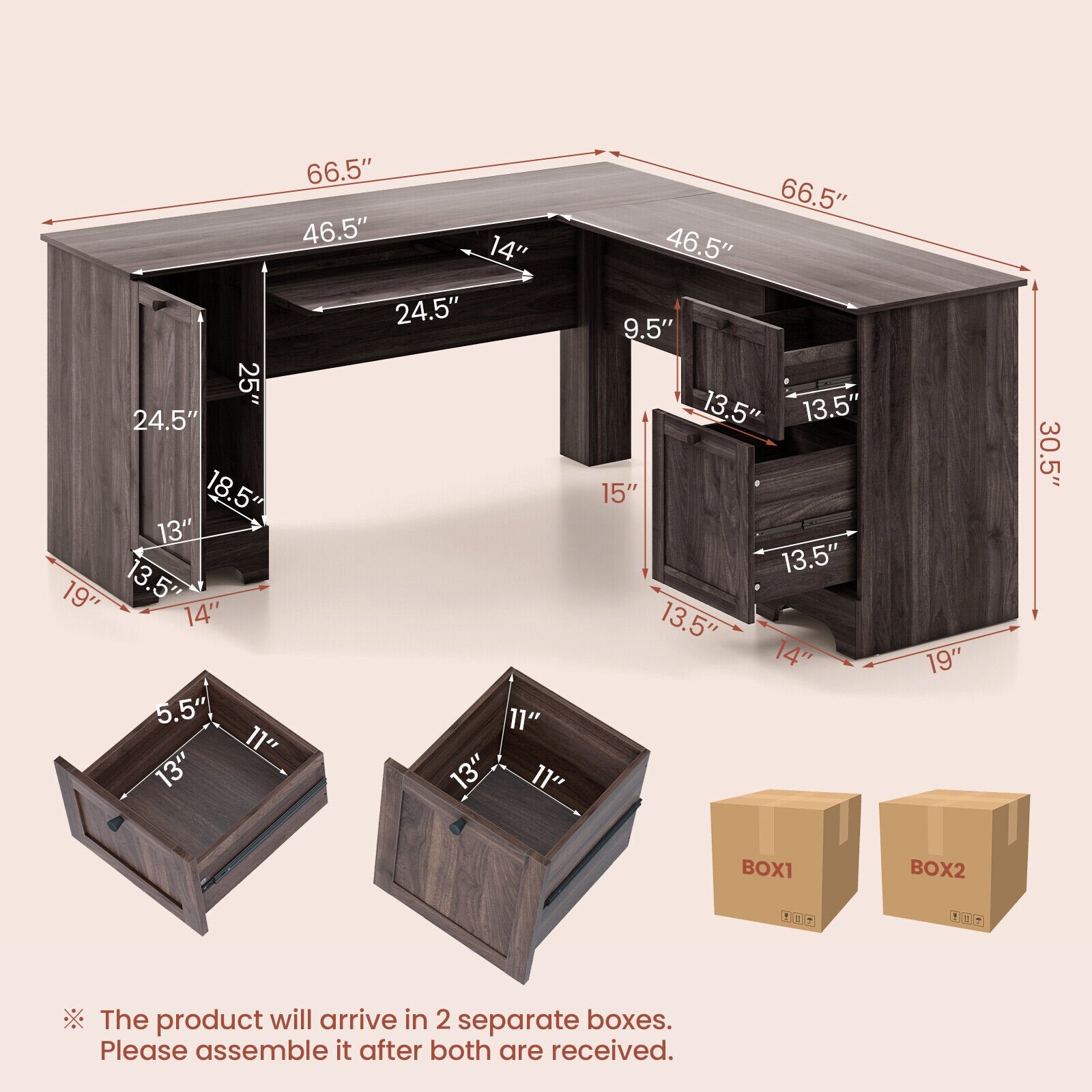 Package and Installation Notes: The product will arrive in 2 separate boxes and the accessories kit is in the box2. Please assemble it after both are received. You can refer to the included detailed graphic instructions for easy setup. In addition the smooth desktop is easy to clean just wipe it off with a damp cloth without too much maintenance.