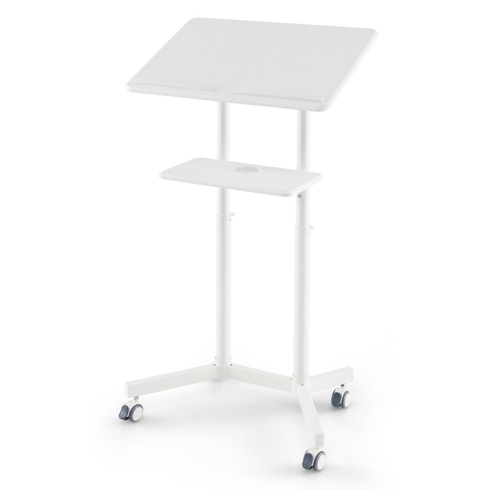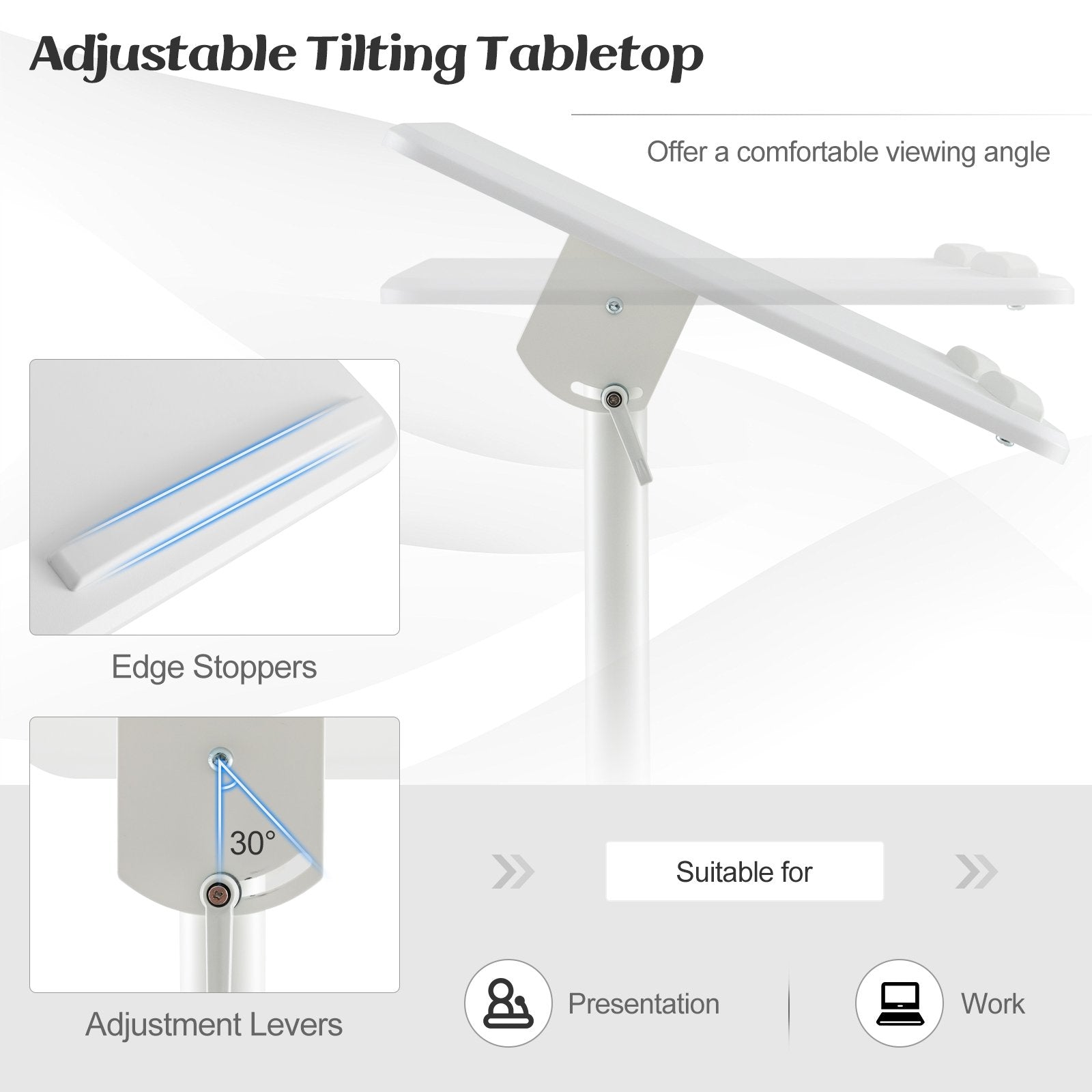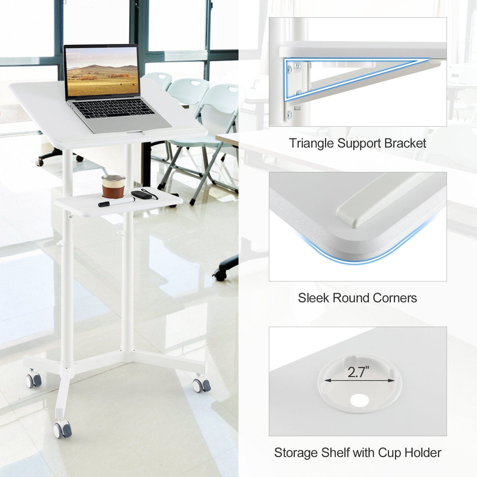 Mobile Lectern Podium Height-adjustable Rolling Laptop Cart with Tilting Top Storage Tray-White