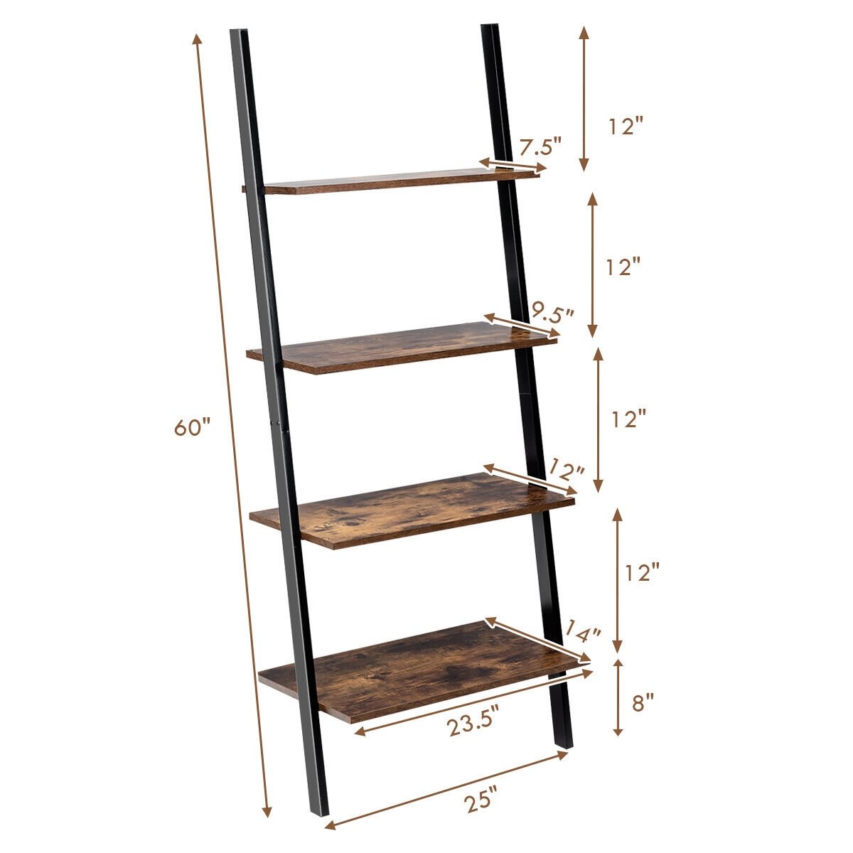 Made of high-quality particleboard each shelf can support items strongly without worrying about easy bending and breaking. The powder-coated metal frame is sturdy and not easy to rust providing a longer service life. While the ladder shelf shows a leaning appearance actually all shelf layers lean against the wall at a 90° angle in order to reach maximum stability. Featuring four open shelves this storage rack is convenient for storing books potted plants photo albums or kitchen supplies in an orderly manner.