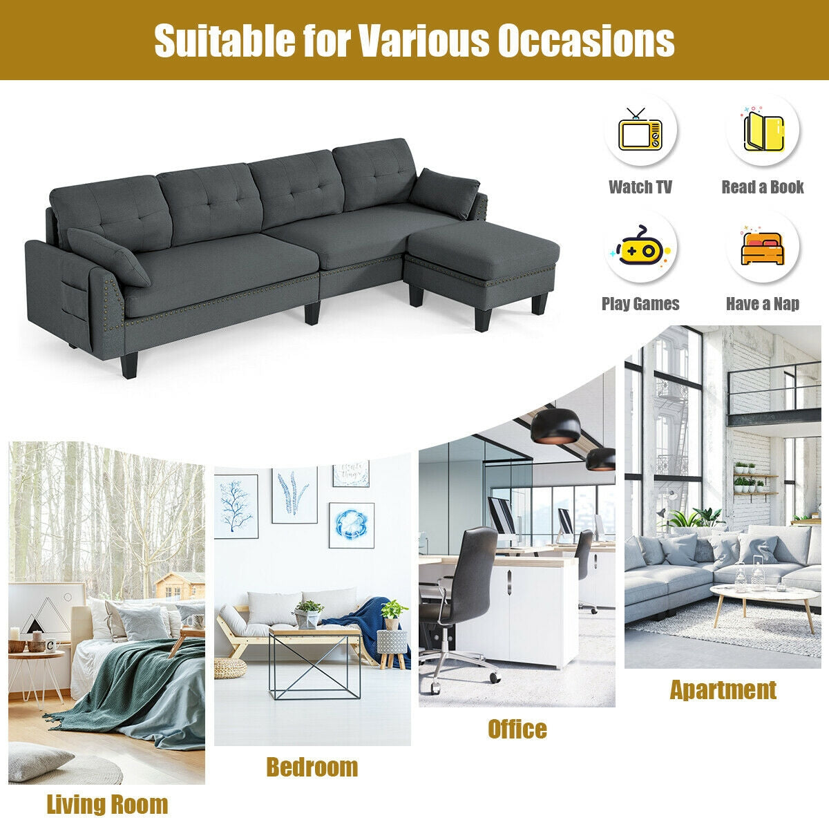 With movable ottoman and 2 sizes of seat cushions this sectional sofa couch can be customized freely according your preference. The long and short cushion can be interchanged thus creatively combining the movable ottoman and 4-seat sofa. And highly resilient sponge is covered with soft and breathable linen fabric to provide a comfortable sitting feeling. The washable cover of cushion is designed with zipper for easy cleaning. A storage bag allows you to store magazines and phone for more convenience. What's more the sofa is supported by solid wood legs to ensure good stability.