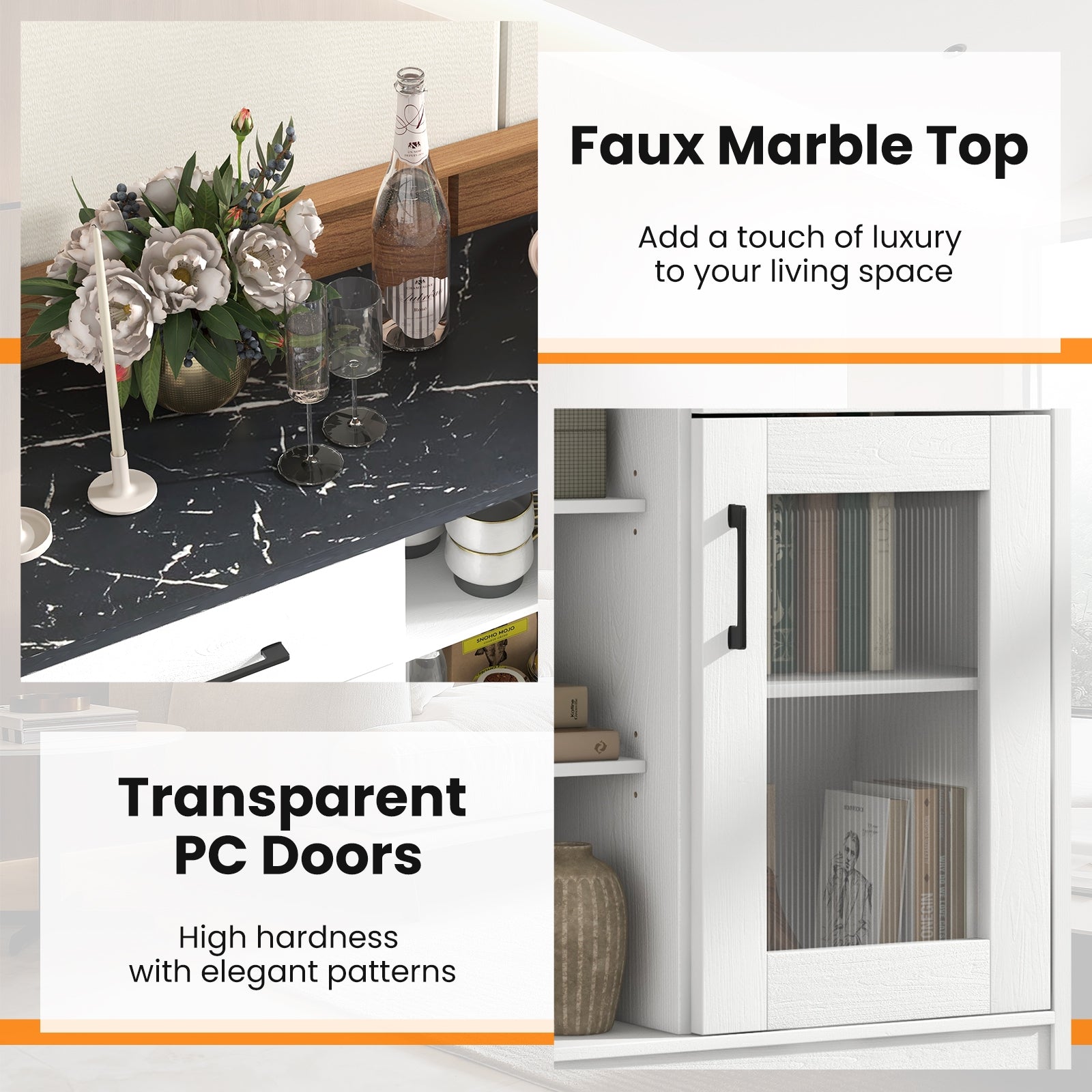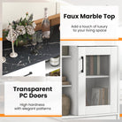 Elegant Design: Featuring faux marble top clear cabinet doors and elegant wood grains the kitchen storage cabinet combines functionality with timeless grace. Its sleek modern charm easily enhances the appeal of your living space regardless of its interior style.