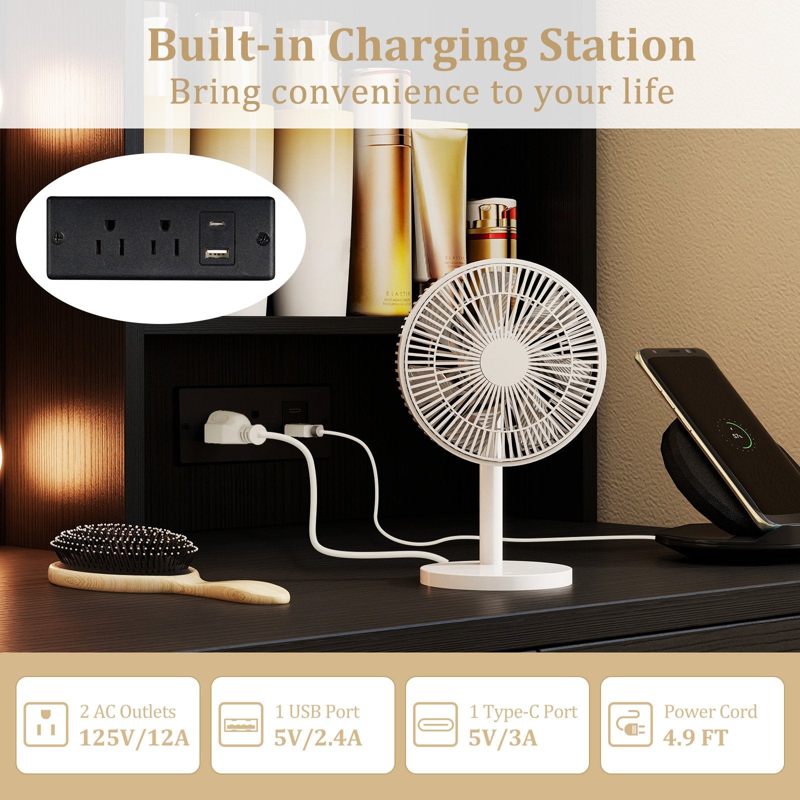 Built-in Charging Station: This makeup table features 2 125V/12A AC outlets 1 5V/2.4A USB port and 1 5V/3A Type-C port making it easy to plug in a hair dryer curling iron or other beauty gadgets right on your vanity. It also provides great convenience for charging cell phones or other electronic devices.