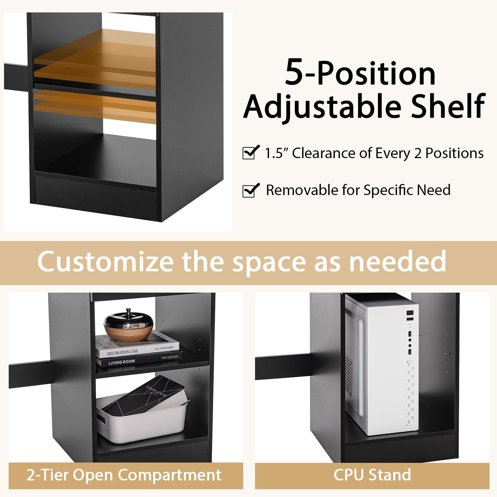 Practical Adjustable and Removable Shelf: The adjustable shelf is also a genius design. It can be adjusted to 5 positions and there is 1.5” between every 2 positions. Therefore you can customize the space according to your needs. Moreover the shelf can be removed which allows you to make the bottom shelf a CPU stand for convenience.