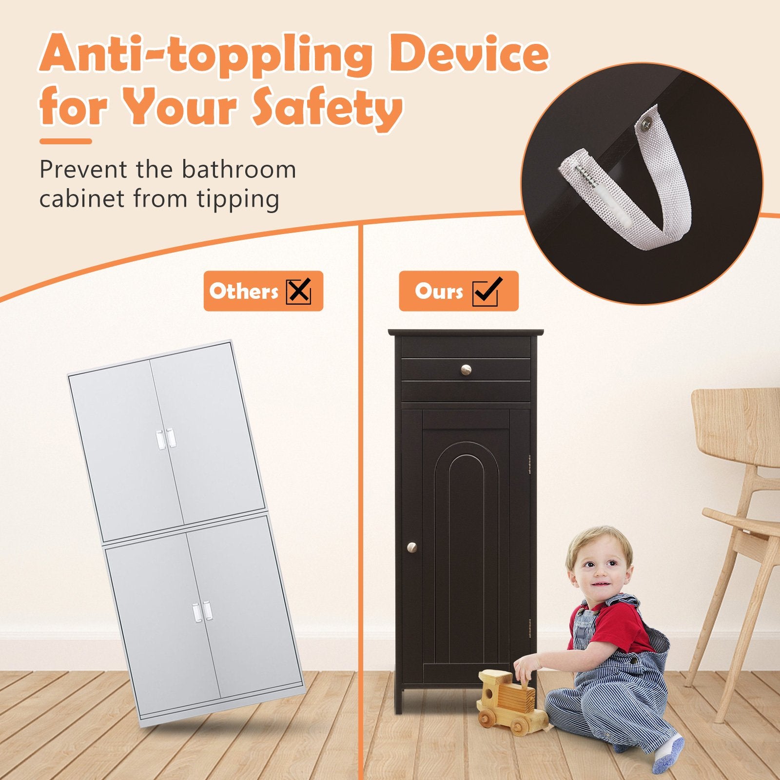 Stable and Safe Structure: The overall structure of our bathroom cabinet is stable and not easy to shake so it can stand freely on the floor without any auxiliary tools. In addition with an anti-topple device on the back this cabinet can be secured to the wall to avoid tipping thus ensuring safer use.